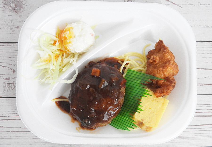 上で紹介した「スポーツ弁当」や「唐揚(5コ)おかず」と比較すると、ぱっと見た感じ量が少なく見えます。しかし、厚みのあるハンバーグのおかげか思ったよりもお腹にずしんときました。ちなみに、厚焼たまごが甘くて子どもが気に入ってました。