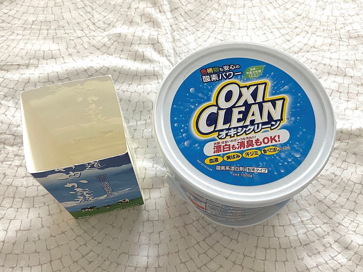 牛乳パックならお湯もオキシクリーンも少量で済むので経済的です。