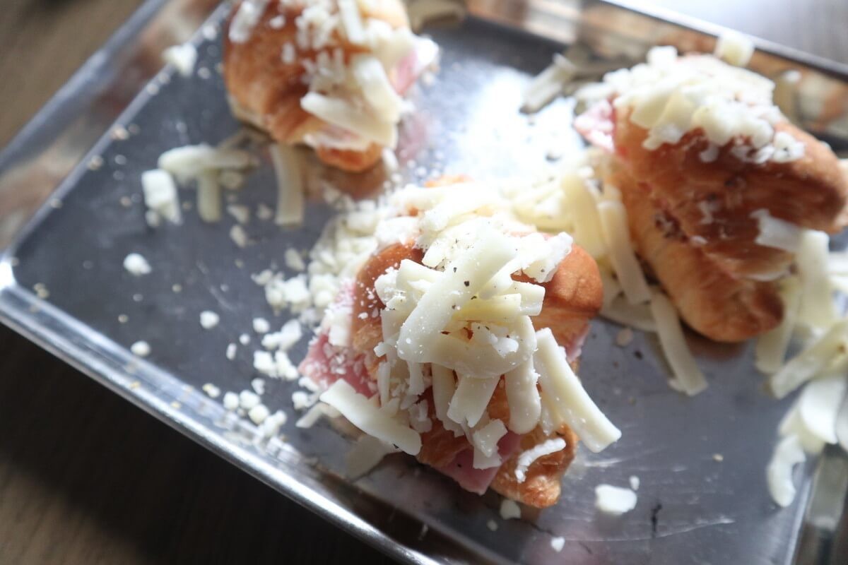 クロワッサンの上部をのせて、軽く押さえつける。 その上からとろけるチーズをたっぷりのせて、ブラックペッパーをちらす。