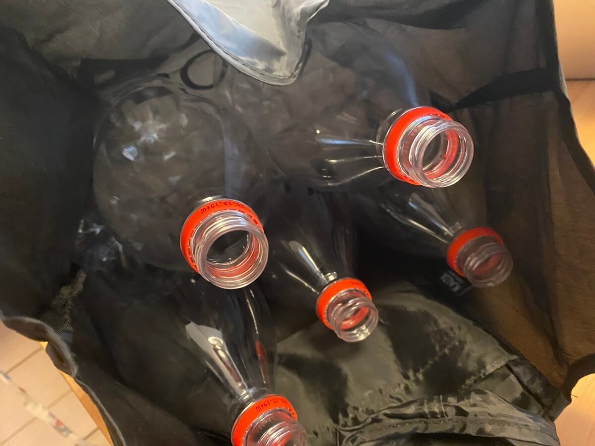 カルディのエコバッグは1.5Lのペットボトルを5本入れても、これだけの余裕。もちろん、お弁当なども入れることができますし、横向きでもペットボトルを入れられます。