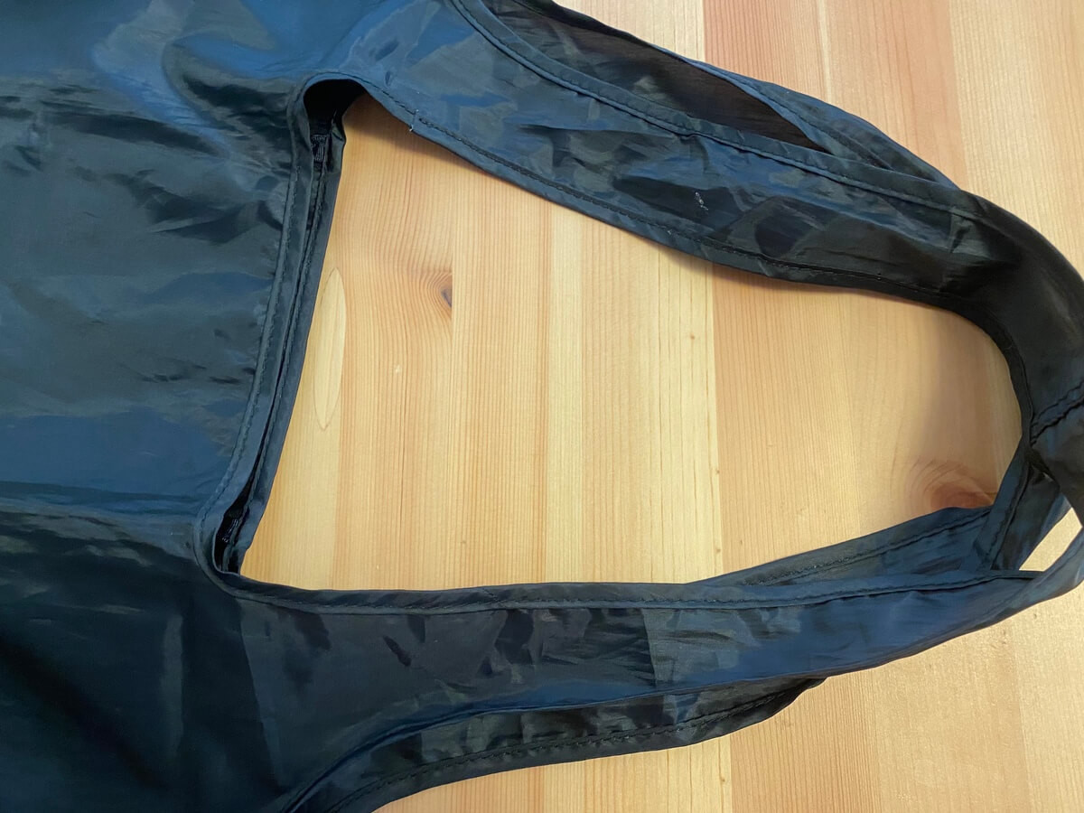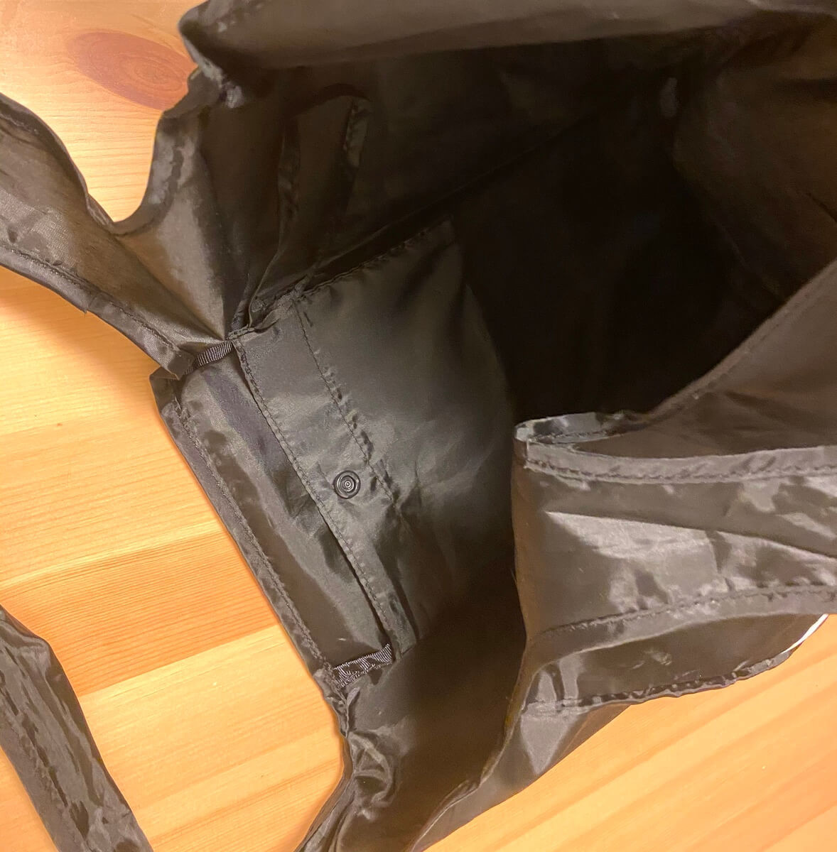 エコバッグがコンパクトに折りたためたら、後は手前にあるポケットに入れ込むだけ。ここまで紹介した手順通りに進めれば、すっきりとポケットに入るはずです。ボタンもついているので、しっかり収納できます。