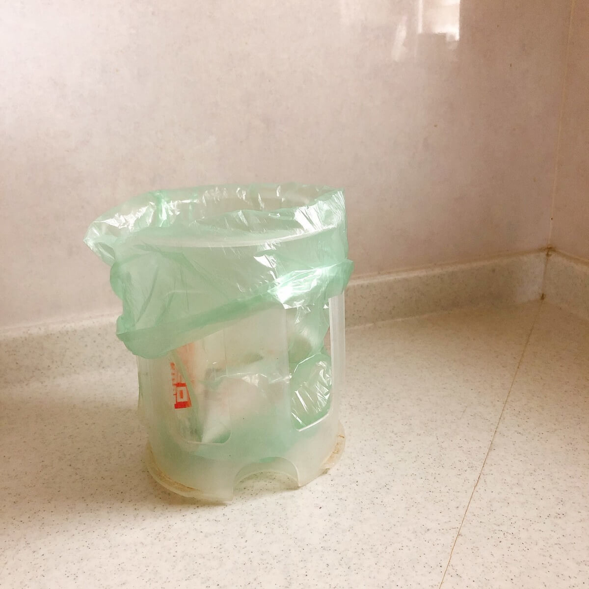 ちなみに使い終わった袋は、これまた100均で売っているお茶碗立てを生ごみ入れにして使用しているので生ごみ用の袋に再利用。 最後の最後までお仕事をして捨てています!