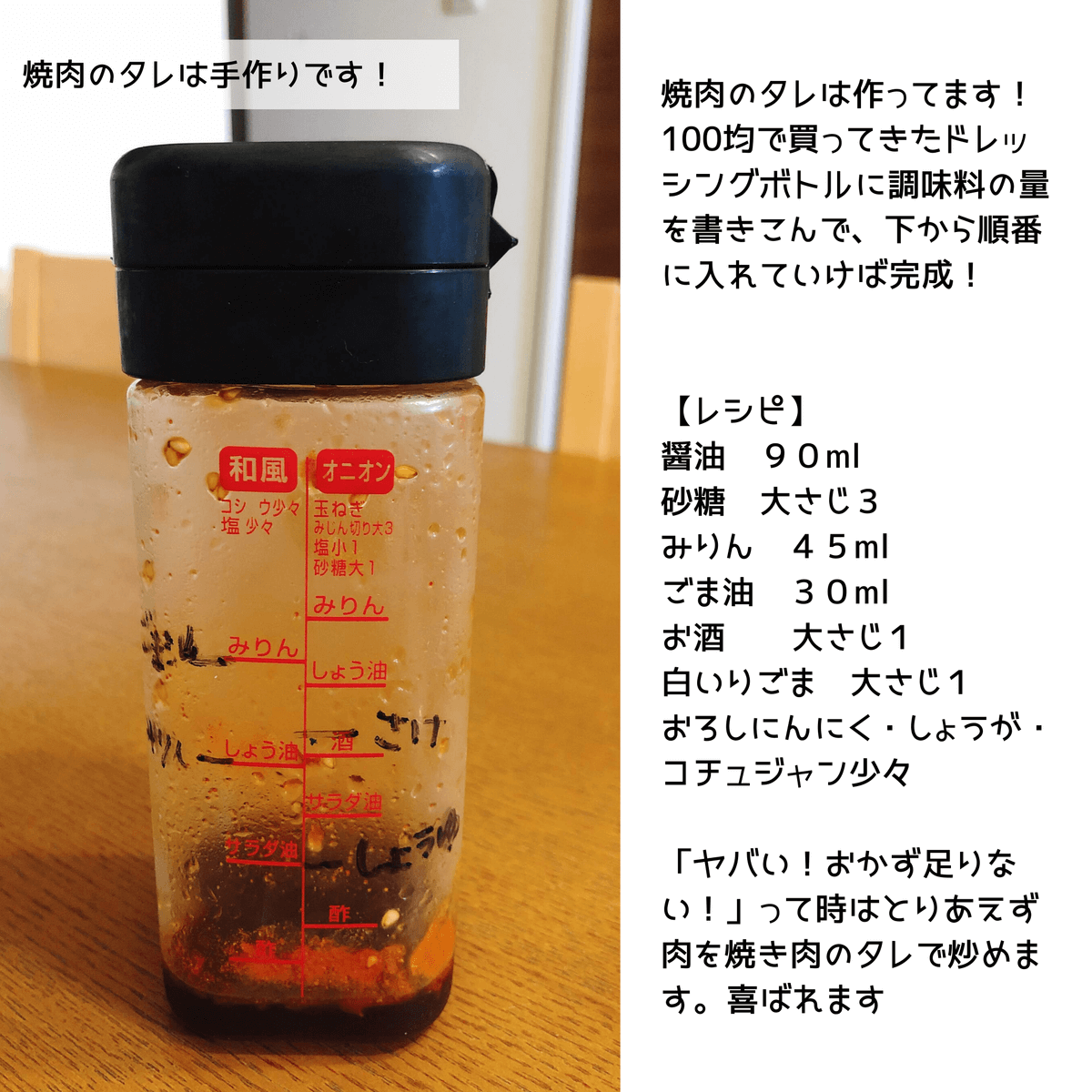 私は、一つ焼肉のタレ専用にしてボトルに調味料の量を線で書き込んでレシピを見なくても作れるようにしました。これが、めちゃくちゃ便利なんです!