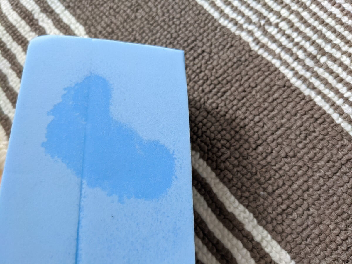 カーペットに飲み物や調味料などをこぼしてしまったときは、まず超吸水スポンジをその上に置きます。 そして上から数秒手で押し、ゆっくりと離します。