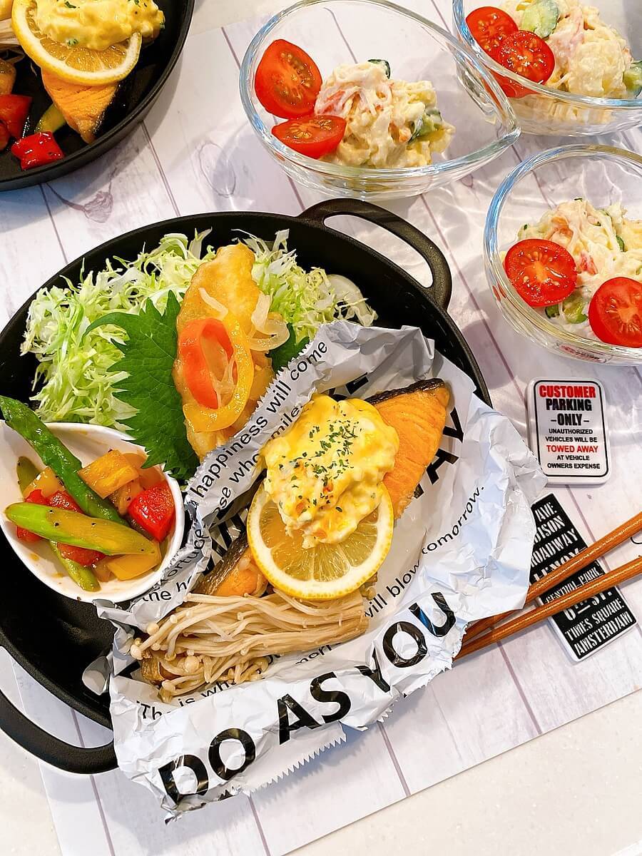 こちらのスクエア型は、先ほどの大皿より一回り小さいので、副菜などを乗せています。