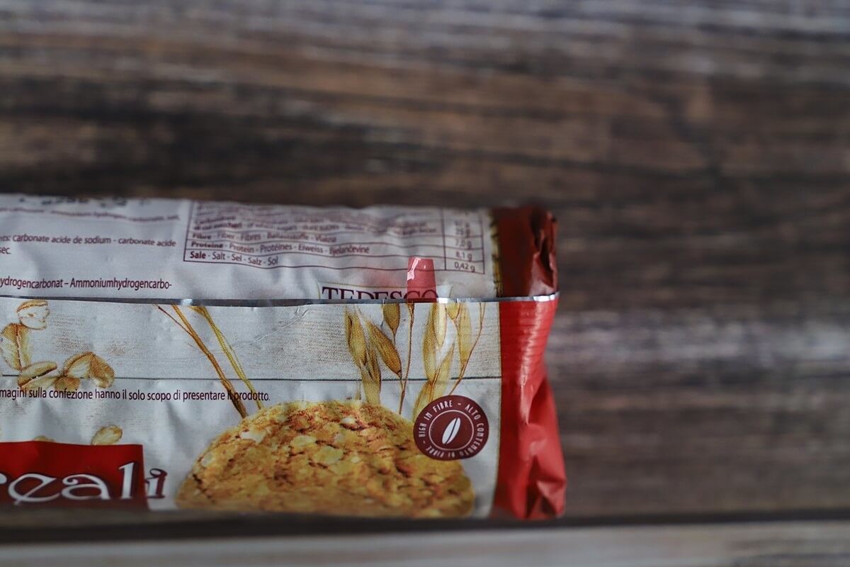 小麦は全粒粉、そしてオート麦フレークもたっぷりと入っています。こちらの商品のパッケージに記載されている成分表示には、食物繊維が100gあたり6.8gとありました。食物繊維たっぷりで嬉しいですね。