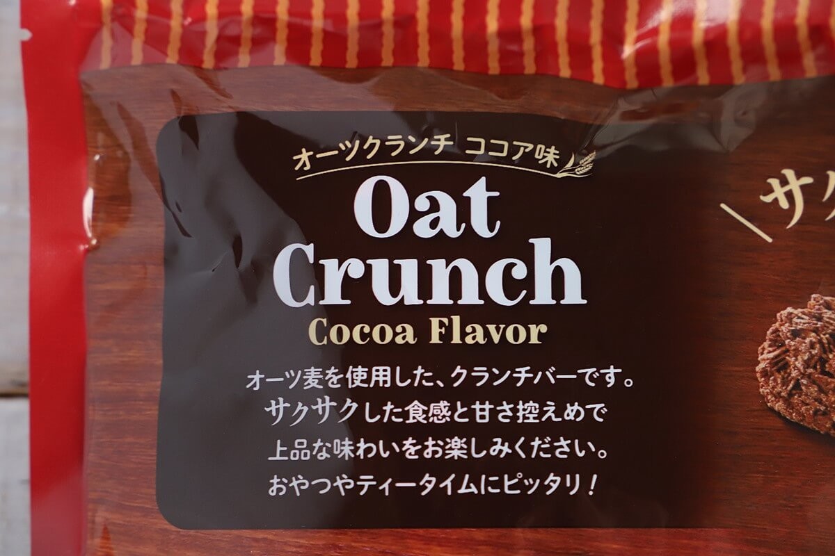パッケージ裏には、「オーツ麦を使用したクランチバーです。サクサクした食感と甘さ控えめで上品な味わいをお楽しみ下さい。」とあります。
