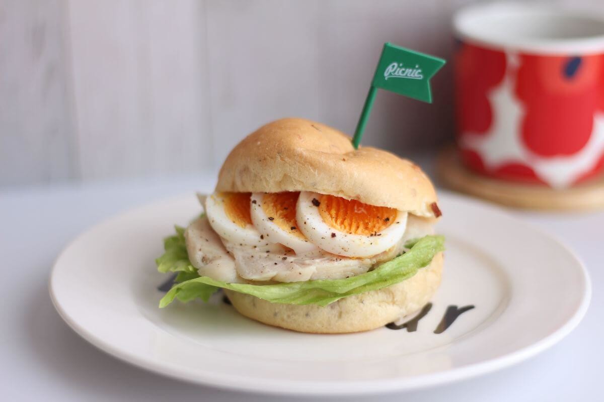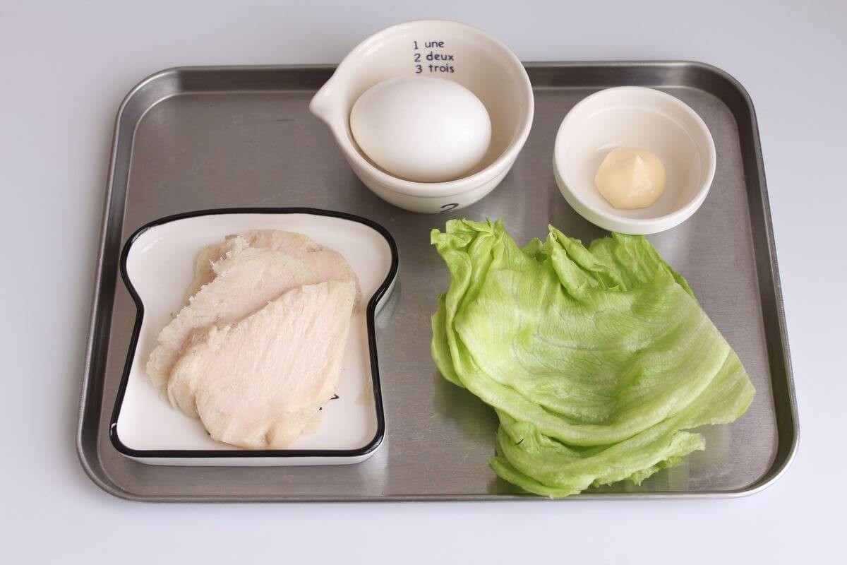厚さ2分の1でカットしたパンを軽くトーストして、その上にレタス、サラダチキン、マヨネーズ、ゆで卵の順に乗せて、もう1枚のパンを重ねる。
