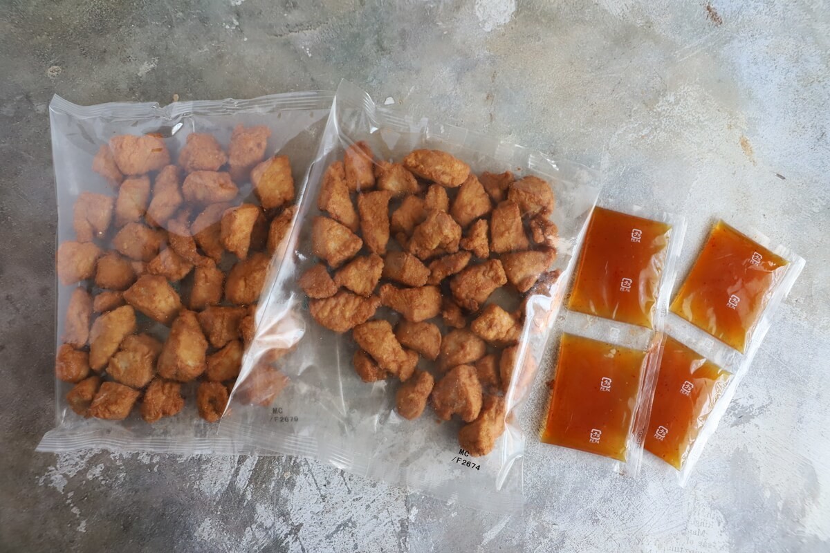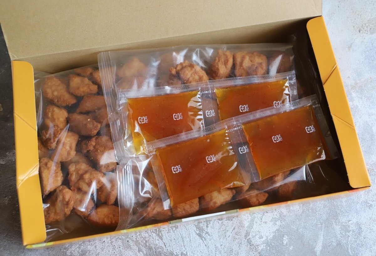 開封すると大きめの袋に、鶏の唐揚げが2袋とソースが4袋入っています。