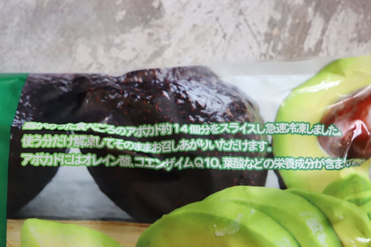 「脂がのった食べごろのアボカド約14個分をスライスし、急速冷凍しました。使う分だけ解凍してそのままお召し上がりいただけます。アボカドにはオレイン酸、コエンザイムQ10,葉酸などの栄養成分が含まれています」とあります。