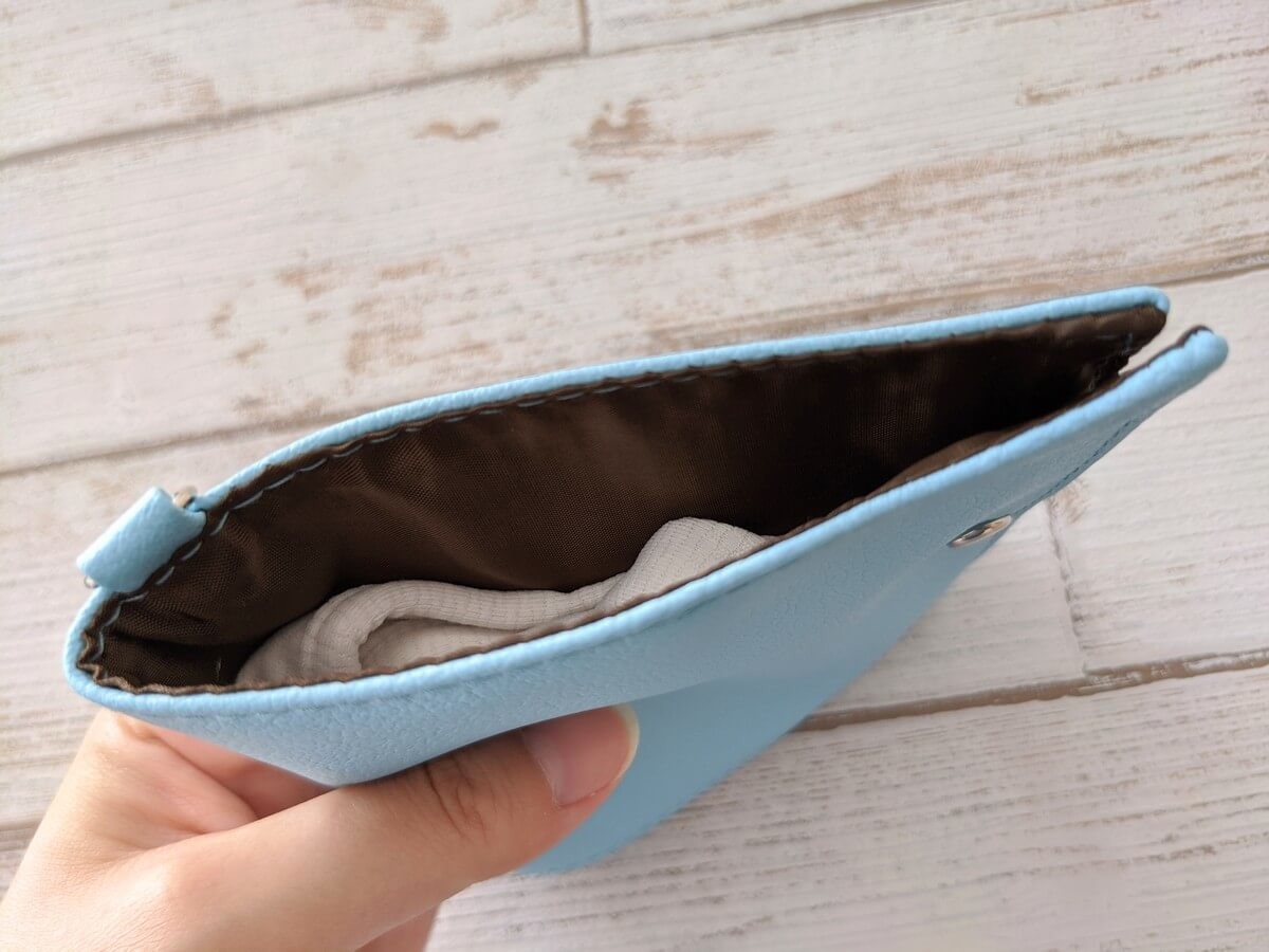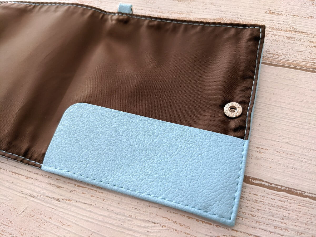 表の生地には、日本製の上質なPVCレザー(合成皮革)が使われています。 使い始めは独特な匂いがしますが、日が経つにつれ徐々に気にならなくなりました。