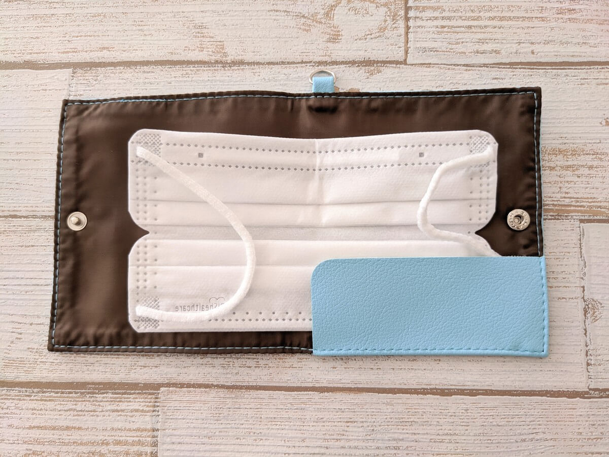 立体型マスクの場合だと、半分に折りたたんだ状態で入れる形です。 ケースから飛び出してしまう場合は、上の方を少し折ってあげるときれいに収まります。