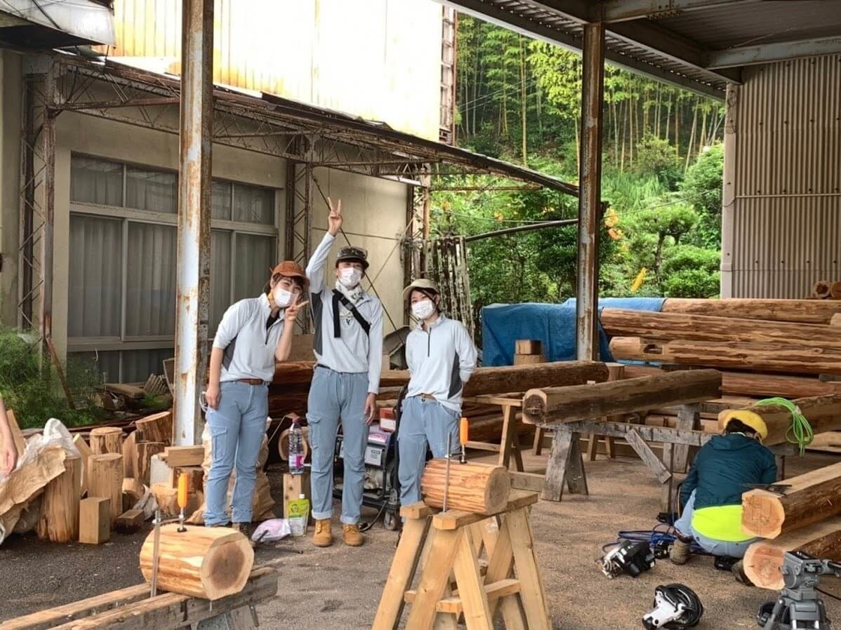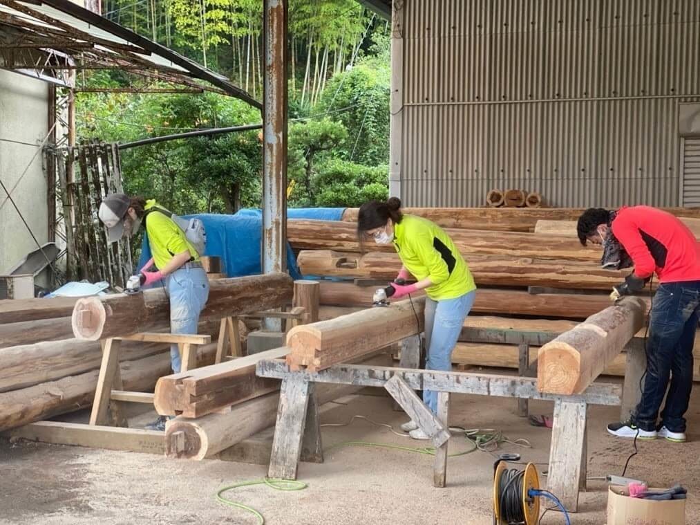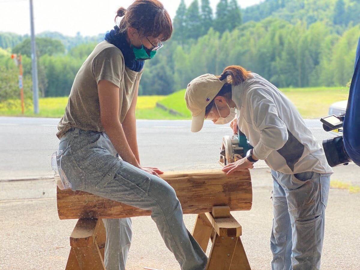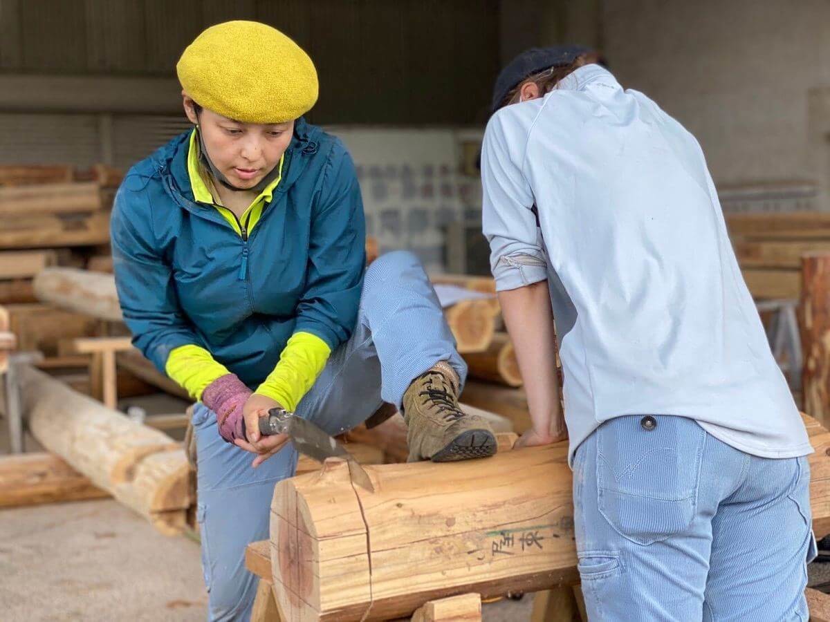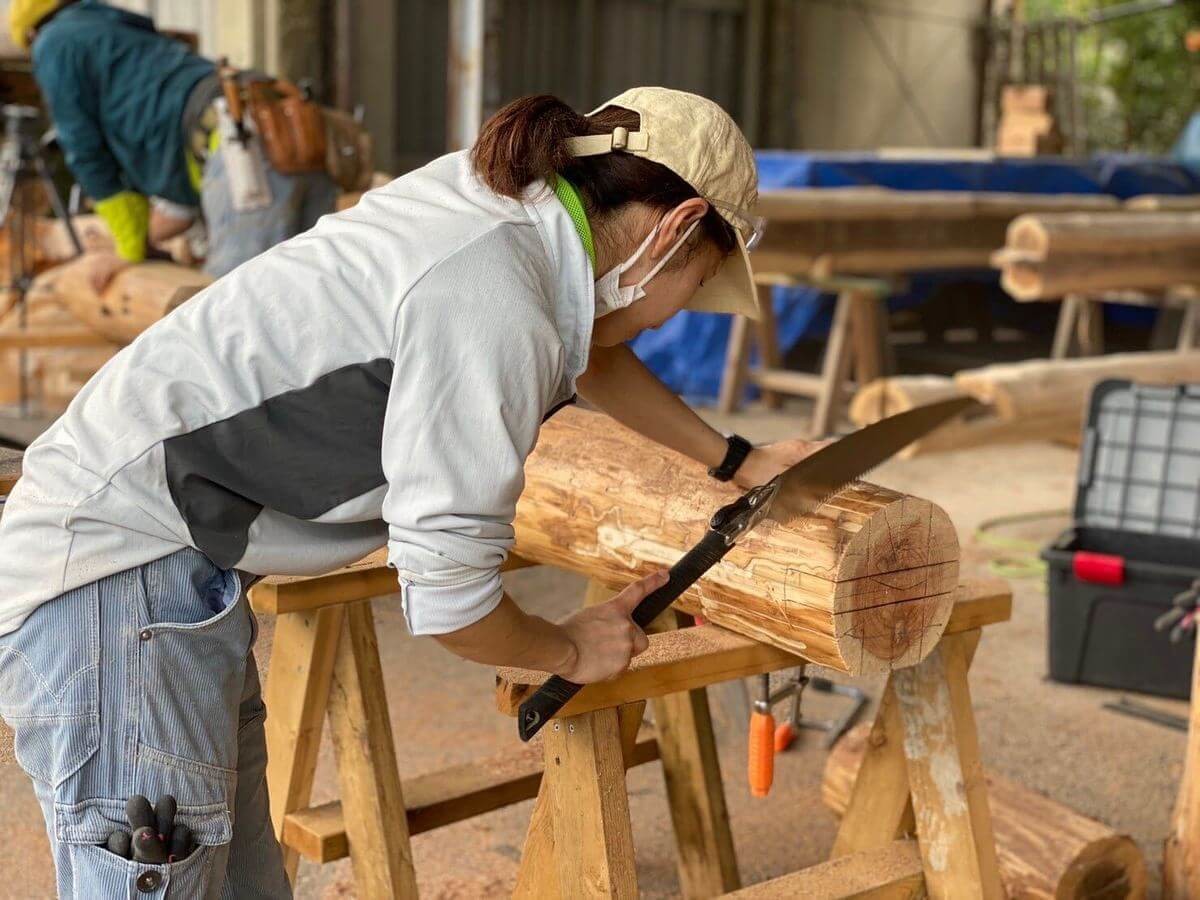 動き回ることも多い作業。みんなで一緒に作業を進める中で、写真のように、メンバーの作業中の丸太にまたがって押さえるなど、本当にたくさん動きます。