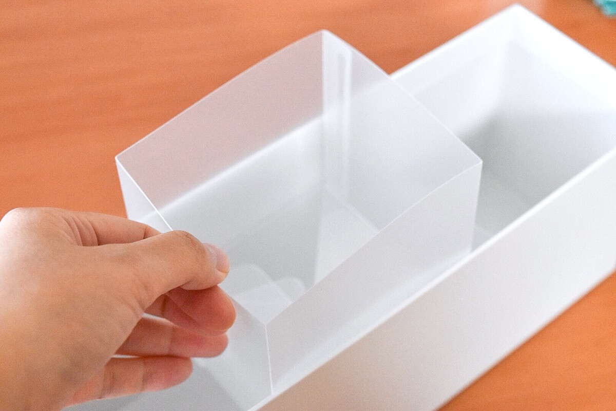 単体で使うには素材が薄くて収納するものによっては頼りないので、2つに区切りたい場合は仕切りボックスではなく仕切り板を使って仕切る方が安心です。