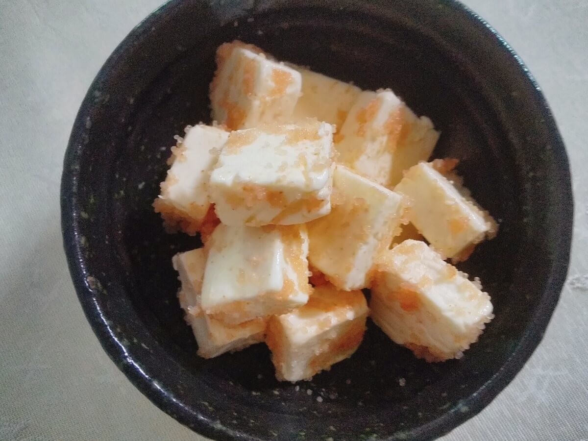 - クリームチーズを食べやすい大きさにカットし、ほぐした明太子と和えます
