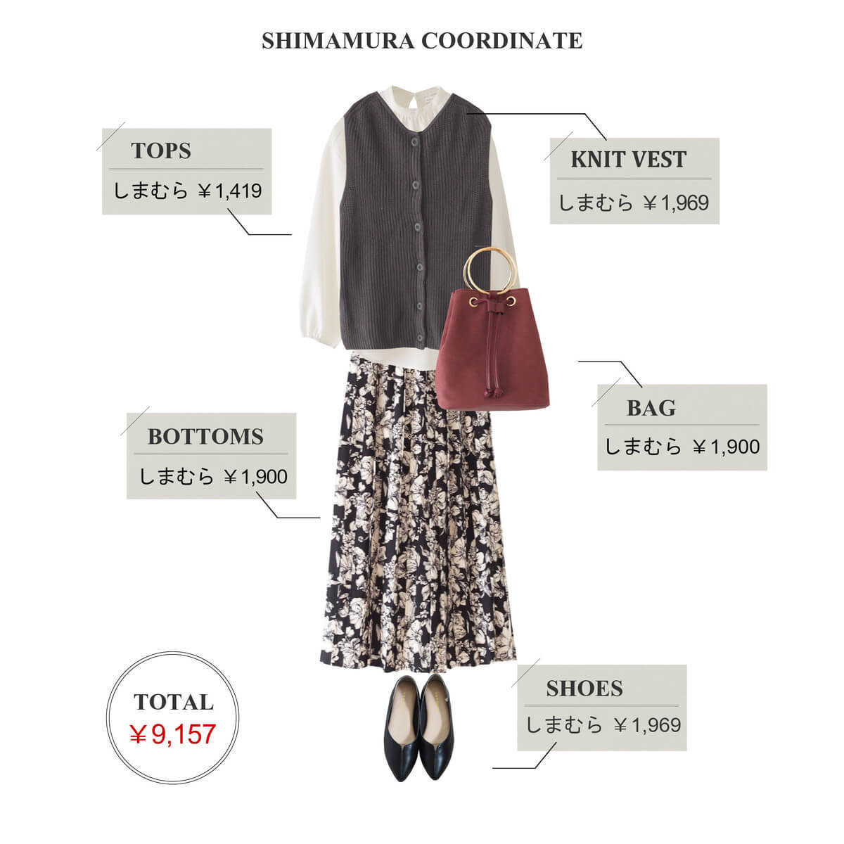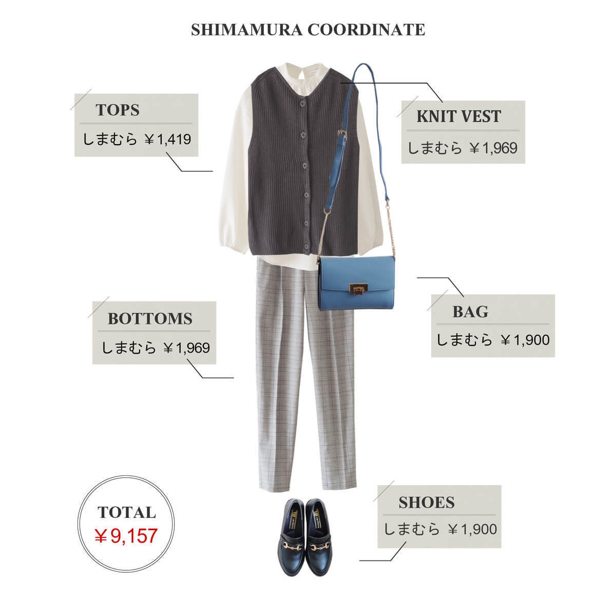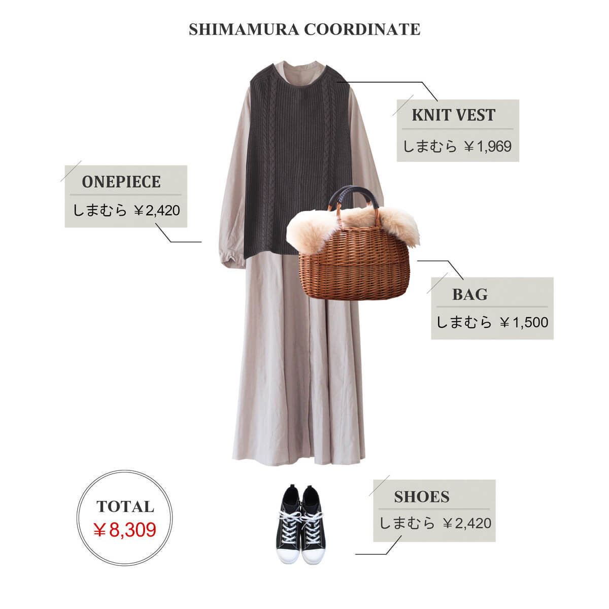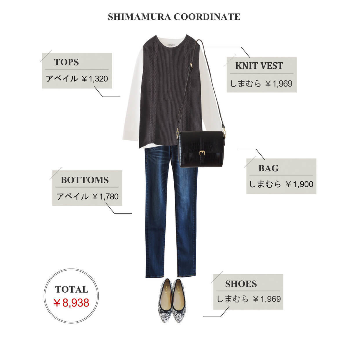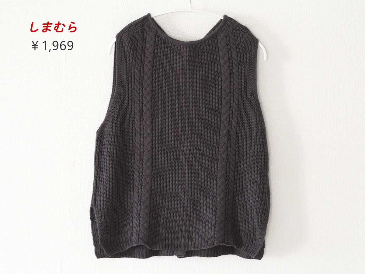 今回は、しまむらで購入したニットベストで4パターンのコーデを考えました。