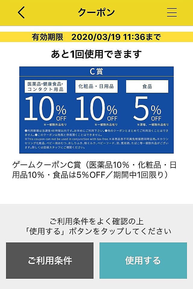 私がよく当たるのは、化粧品・医薬品・日用品が10%OFFに、食料品が5%OFFになる、「C賞」が多いです♪