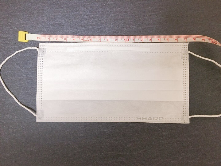 マスクのサイズは縦が約9cm、横が約17cm。「SHARP」のロゴがキラリと光って見えるのは気のせい?なかなか手に入らないからこそ、着けているときはちょっと鼻高々な気分になります。