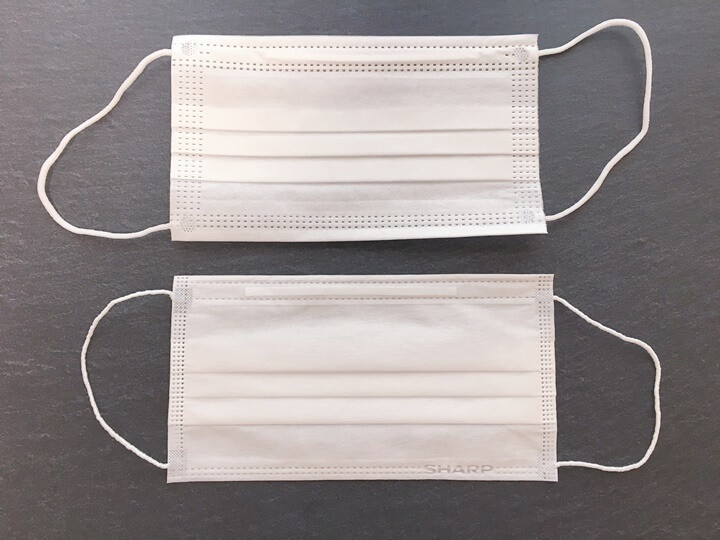 ここでは50枚入り1,078円(税込)で購入した市販のマスクと比較してみたいと思います。上が1,078円、下がシャープ製のマスクです。