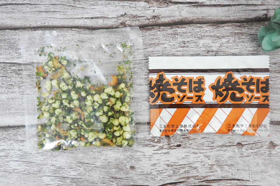 カップ焼きそばのふたを開けると、かやくと粉末ソースが入っています。いままで幾多の格安カップ焼きそばを食べてきましたが、揚げ玉が入ってるのは珍しいですね。