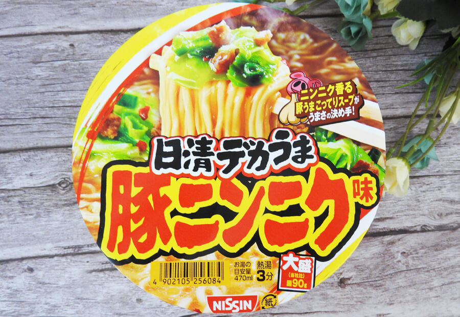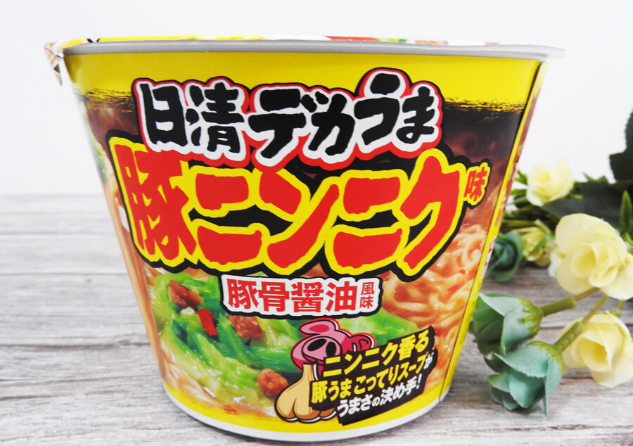 ニンニクが強い!日清「デカうま 豚ニンニク味 豚骨醤油風味」89円(税抜)
