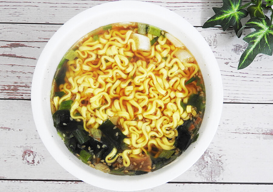 作ってみるとスープが真っ赤!辛そうなですね……。実際に食べてみると、キムチや唐辛子がしっかりと感じられて辛いことは辛いんですが、激辛というではありません。スープのベースが醤油だからなのかもしれませんが……。もうちょっとガツンとした辛さを想像していただけに、ちょっと残念でした。