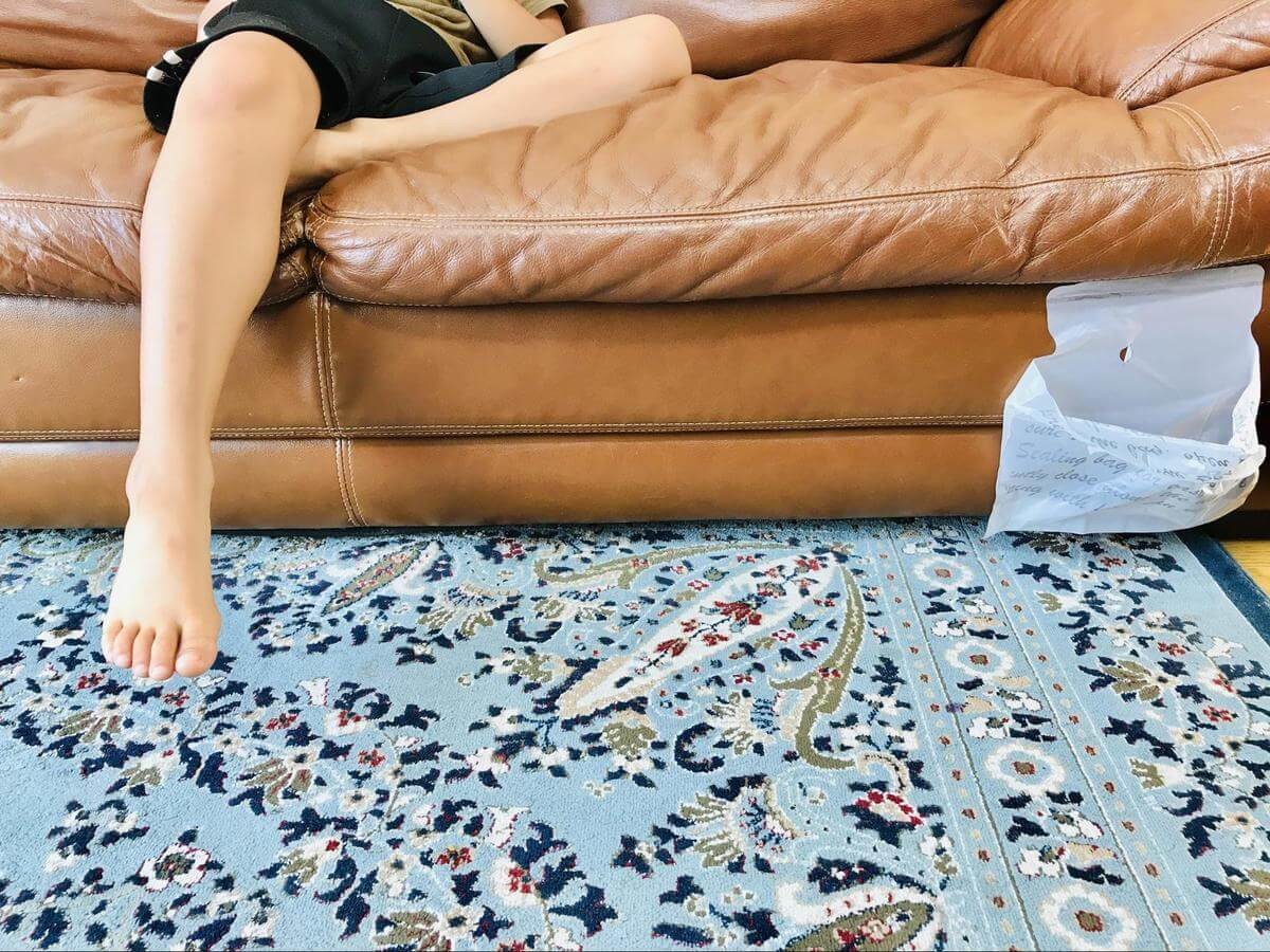 家でくつろぐときも、我が家には「どこでもペタッとゴミ袋」の姿が!お気に入りはソファの下部に貼っておくスタイルです。