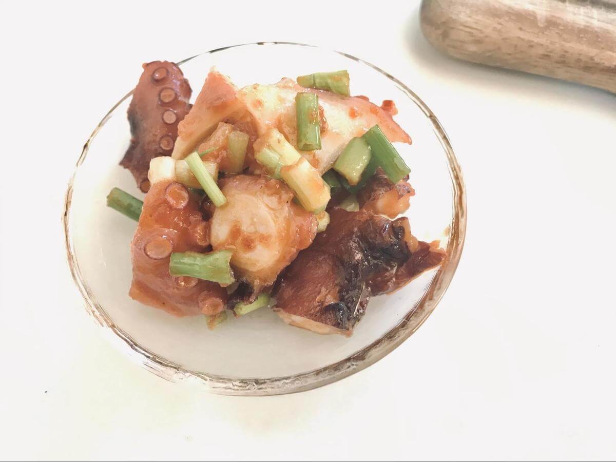仕上げに胡麻油と刻みネギを加えてさっと混ぜたら、おつまみにもぴったりの一品が完成です。パスタソースの量はお好みで調節し、濃いめに仕上げたいときは醤油を少々加えましょう。 「ピリ辛ソース+胡麻油+タコ」の組み合わせで、お酒もすすみそうですね♪