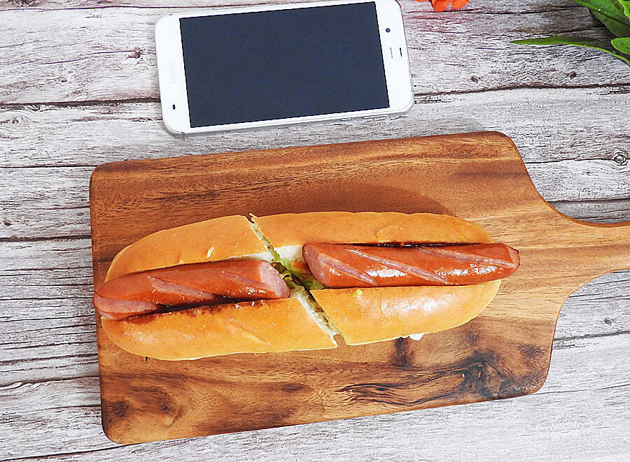 AQUOS SERIE SHV34 au(73×149×7.6mm)と比べてみました。ホットドッグのサイズとしては、一般的~やや大きめなのかなと思います。