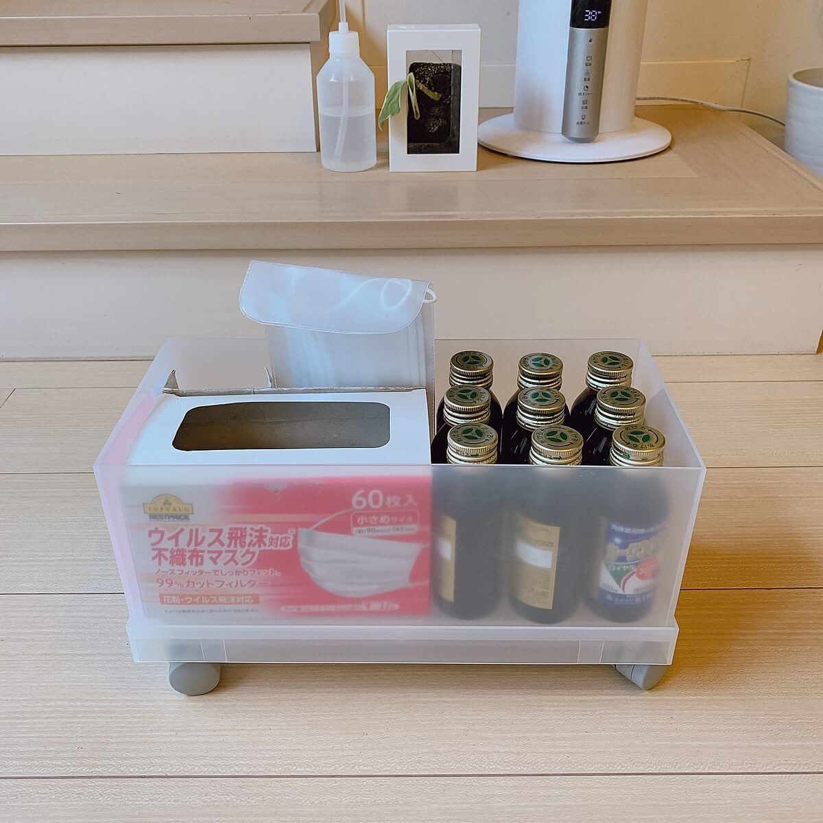 ほとんどが中身が見えない白なのですが、今回は半透明のファイルボックスにキャスターを追加し、ちょっとした場所に便利な収納コーナーを作りました。