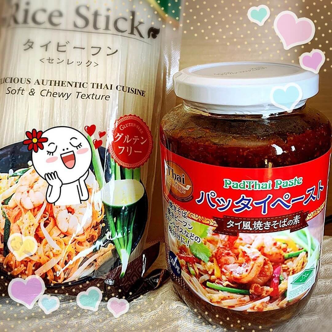 業務スーパーのアジアン調味料のコーナーに並んでいるパッタイペースト。 パッケージに書いている通り、タイ風焼きぞばが手軽に作れるんです。