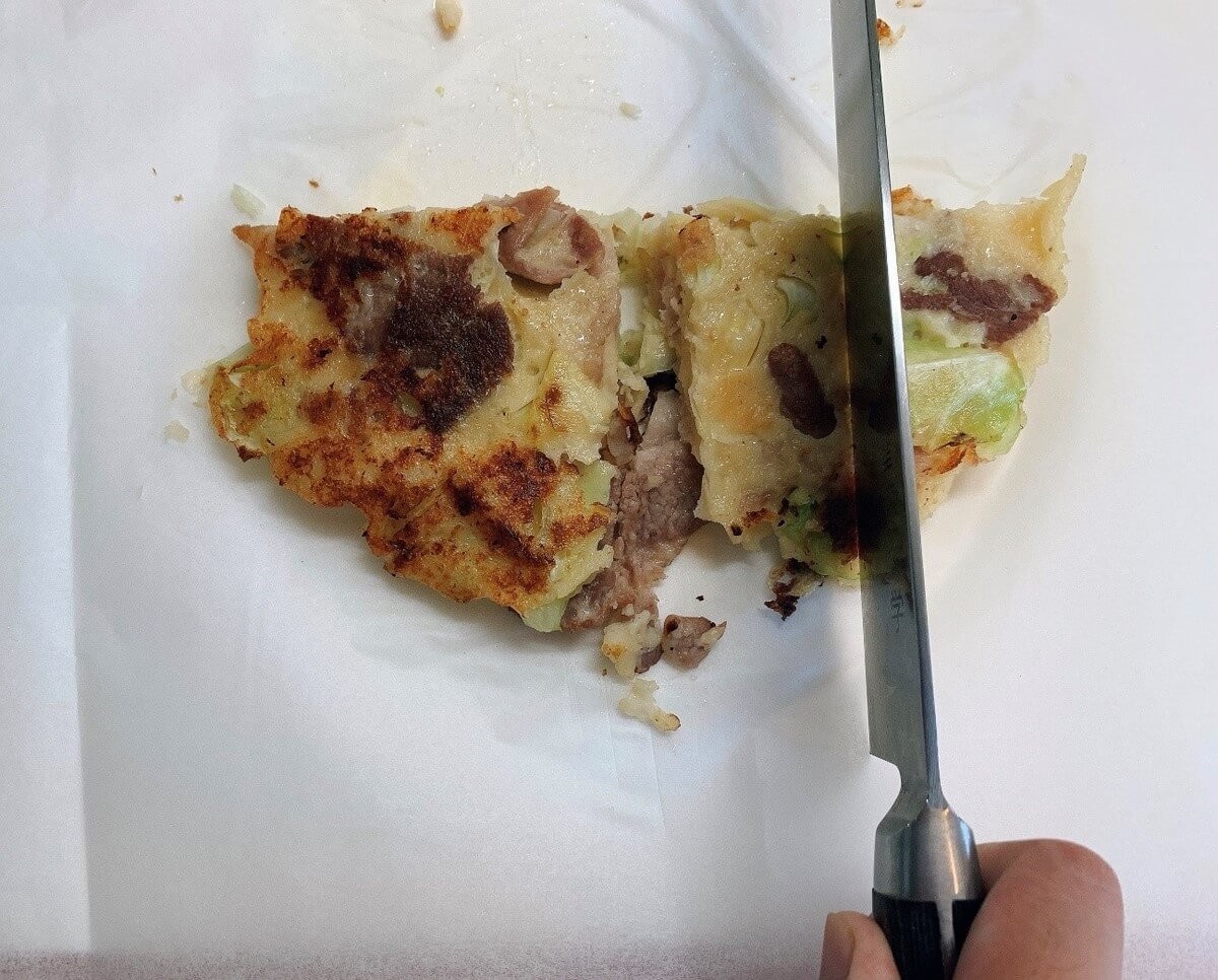 包丁だと、お好み焼きの肉がどうしても切れない!