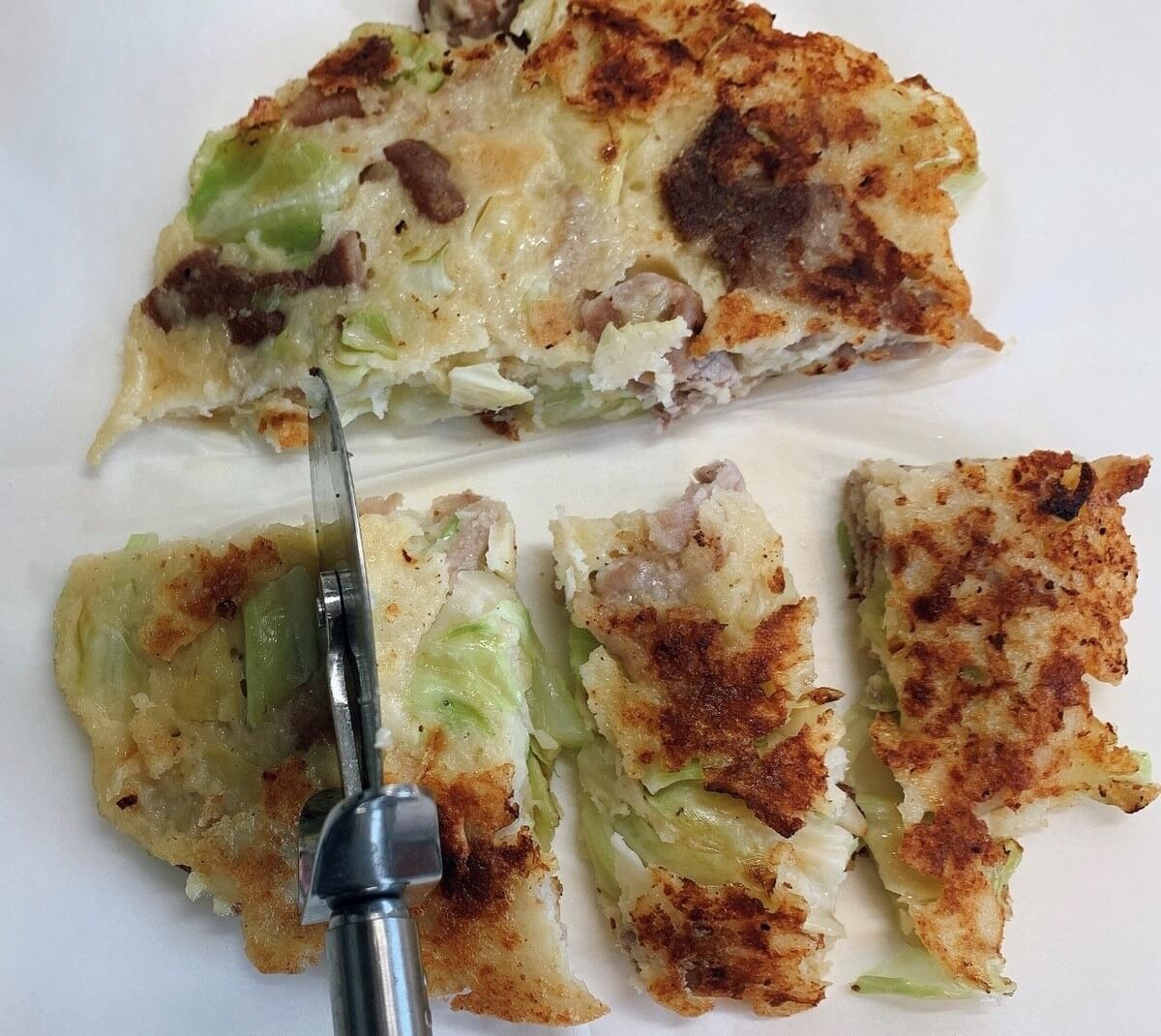 包丁を前後に動かしながら格子切りしたところ、生地と中に入っているキャベツはきちんと切れたのですが、お肉だけはどうしても切りきれません。