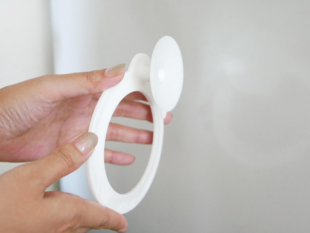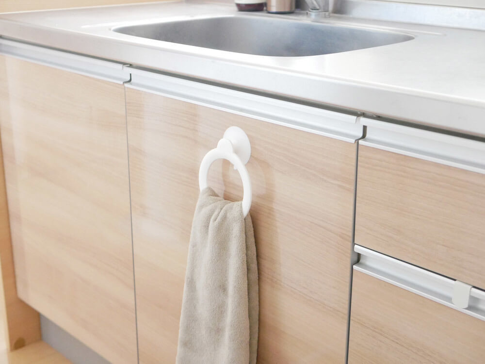 「タオルリング」は手でもグニュと曲がるくらい柔らかいので、ぶつかっても痛くありません。しかも、シンク下の引き出しや扉などに吸盤でかんたんに取り付け・取り外しができますよ♪
