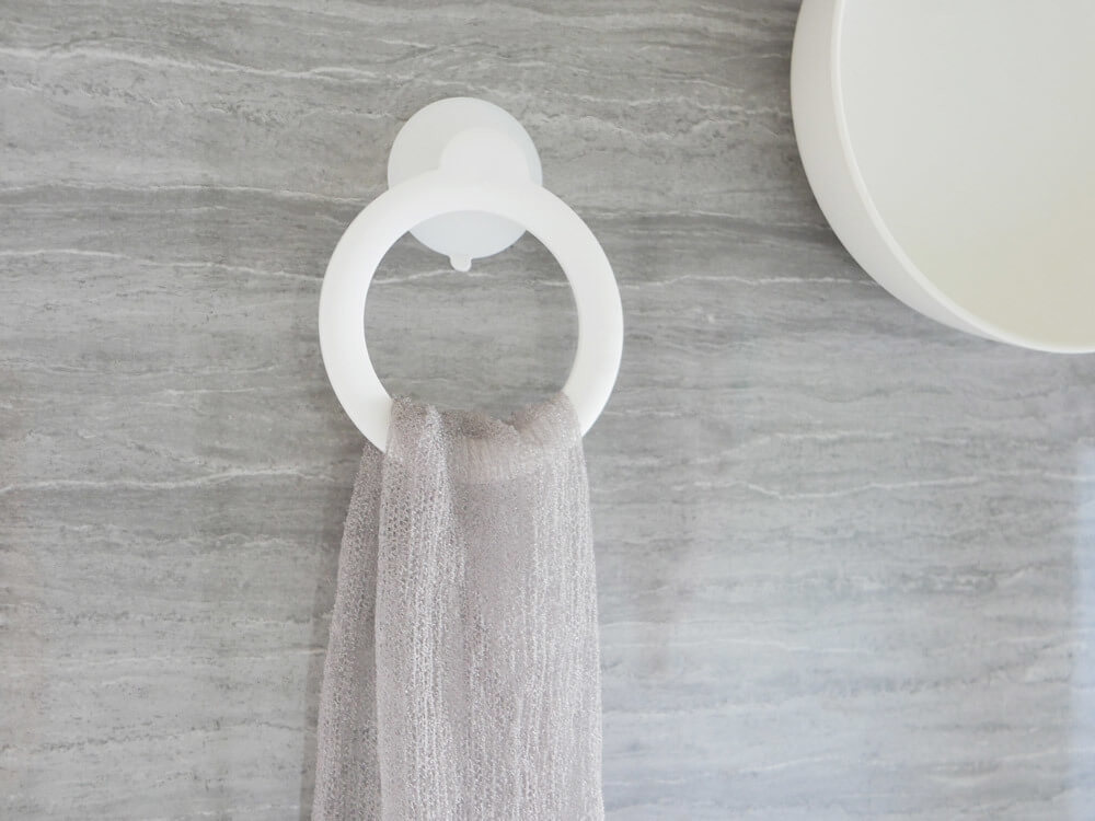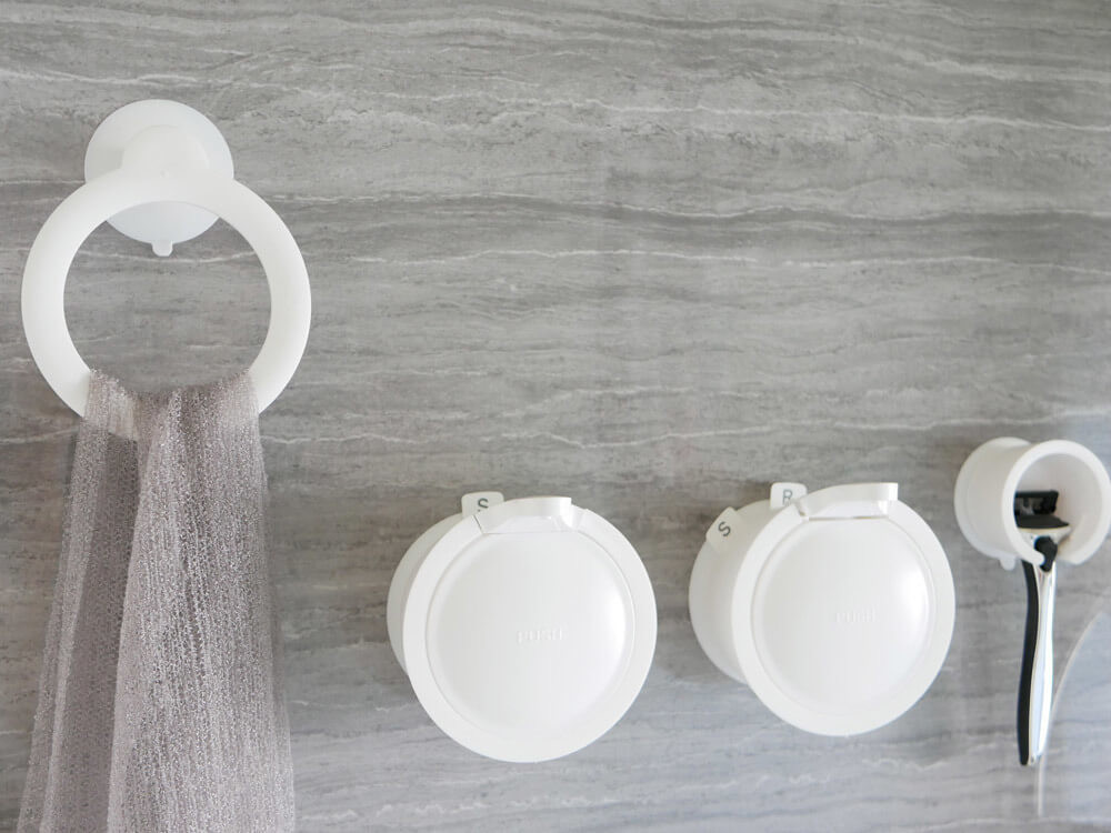 【mog】タオルリングなら、やわらかい素材はお子様や年配の方が、ぶつかっても痛くないので安心ですし、滑りにくい素材なのでするすると落ちてしまう不満も減るはず。吸盤なのでキッチンやバスルーム、パウダールームなどの平滑で光沢のある壁面に自由に取り付けられます。