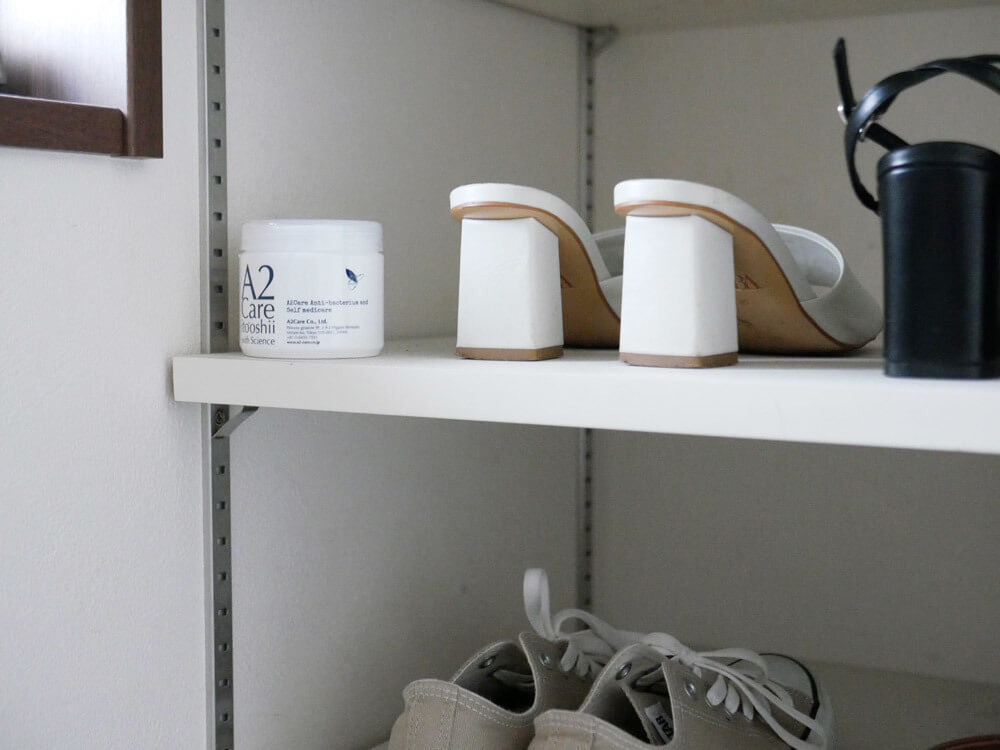 靴箱を開けた時、もわんと顔に乗っかるような重い臭い。思わず顔を背けちゃいますよね。 でも、そんな所に「A2Careゲル」を置けばもうそんな事は起こりません。
