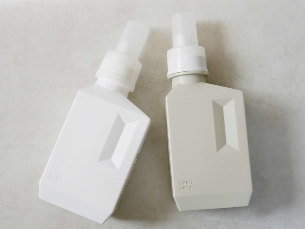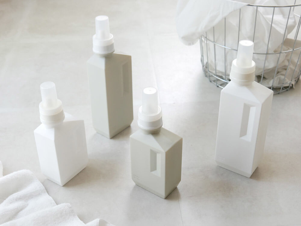 洗濯洗剤・柔軟剤、デリケート衣類用洗剤など、用途によって色違いで並べれば、インテリア小物のようにお洒落に佇みます。