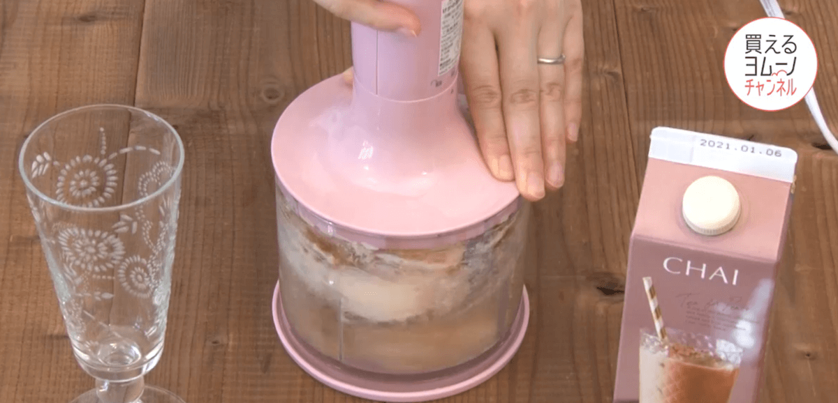 凍らせたアイスチャイと、バニラアイスをフードプロセッサーに入れて撹拌します。