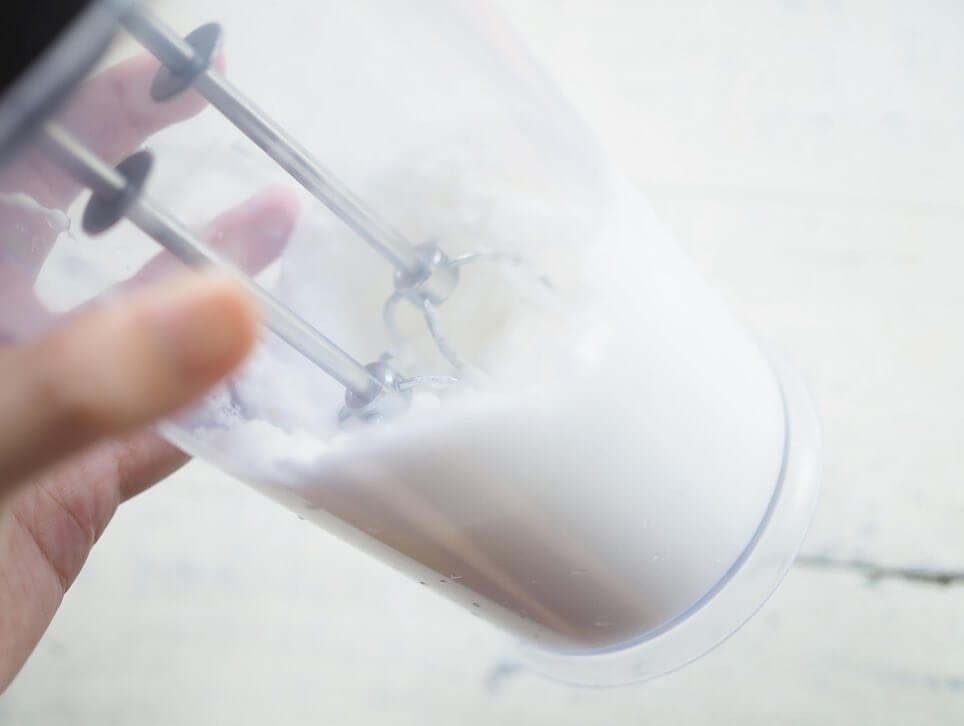 ④ハンドミキサーで卵白をふっくらするまで混ぜ、砂糖1/2を加えて角が立つまで泡立てる