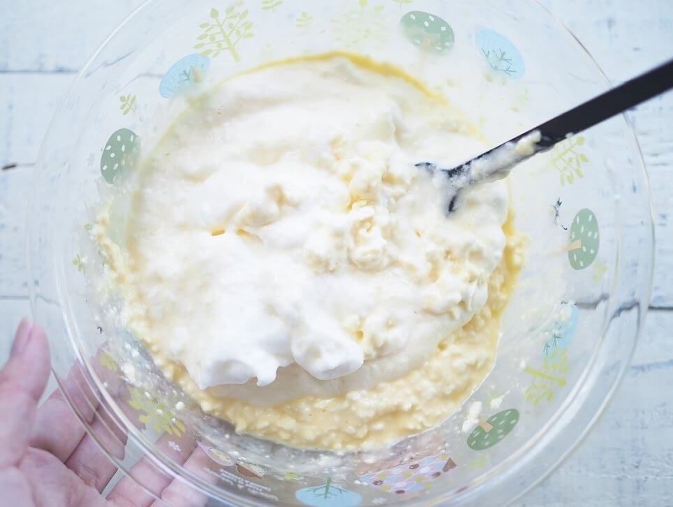 ⑤(4)に(3)を少量加えて混ぜ、泡を潰さないように残りを2回に分けて加え、底からすくうように混ぜる