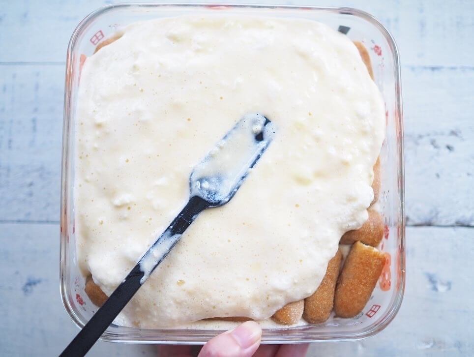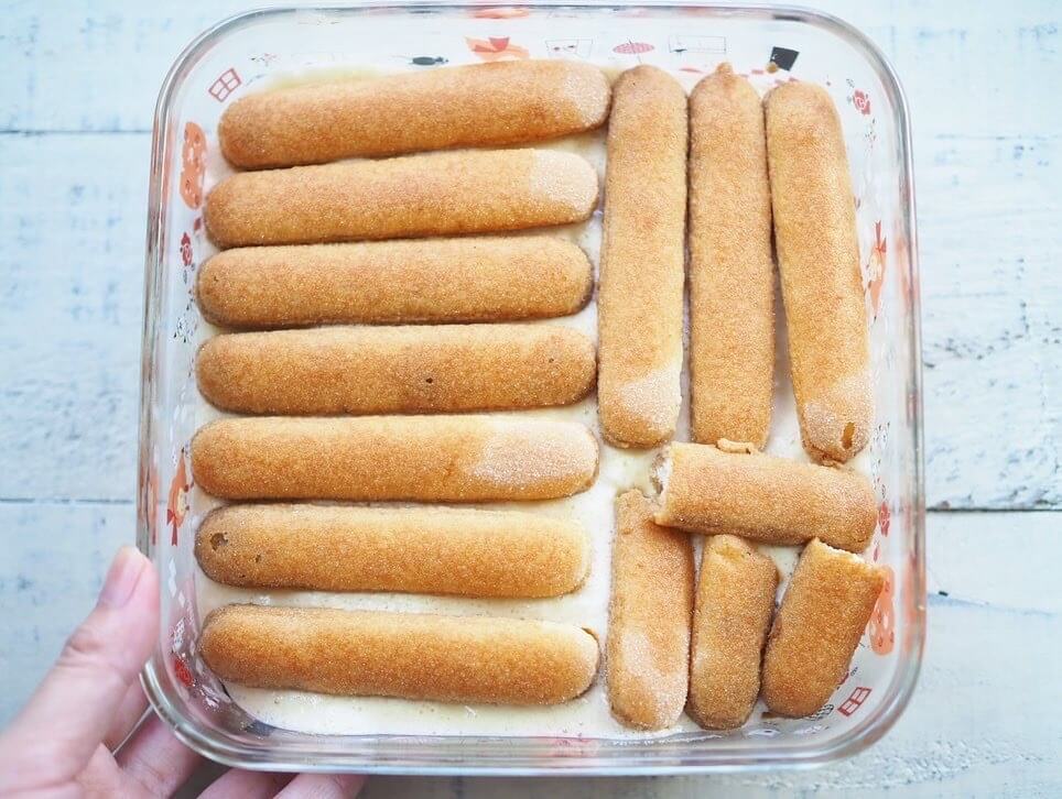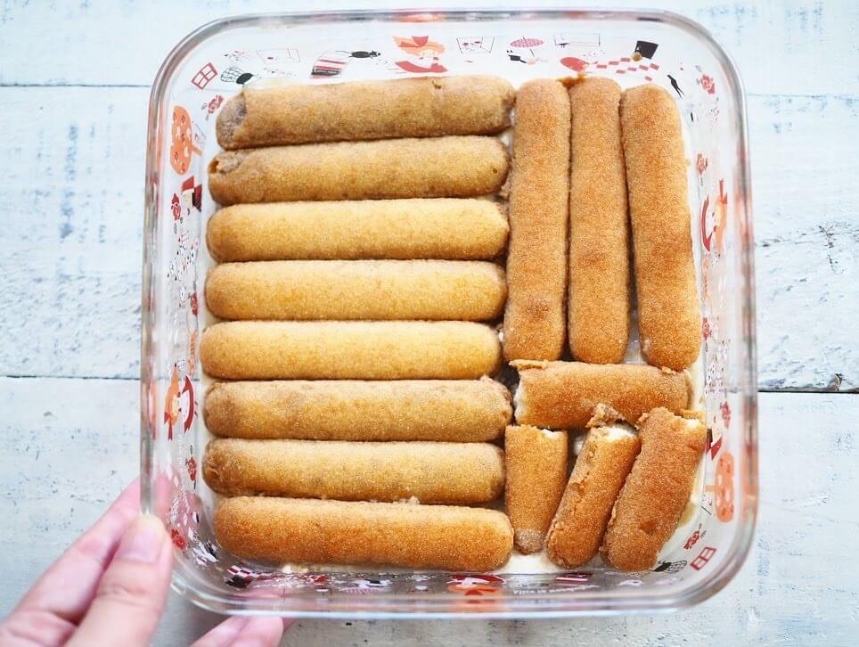 ⑦その上に(6)のクリームを1/2入れ、さらにコーヒー液に浸したビスケットを並べ、残りのクリームを全て流して2層にする