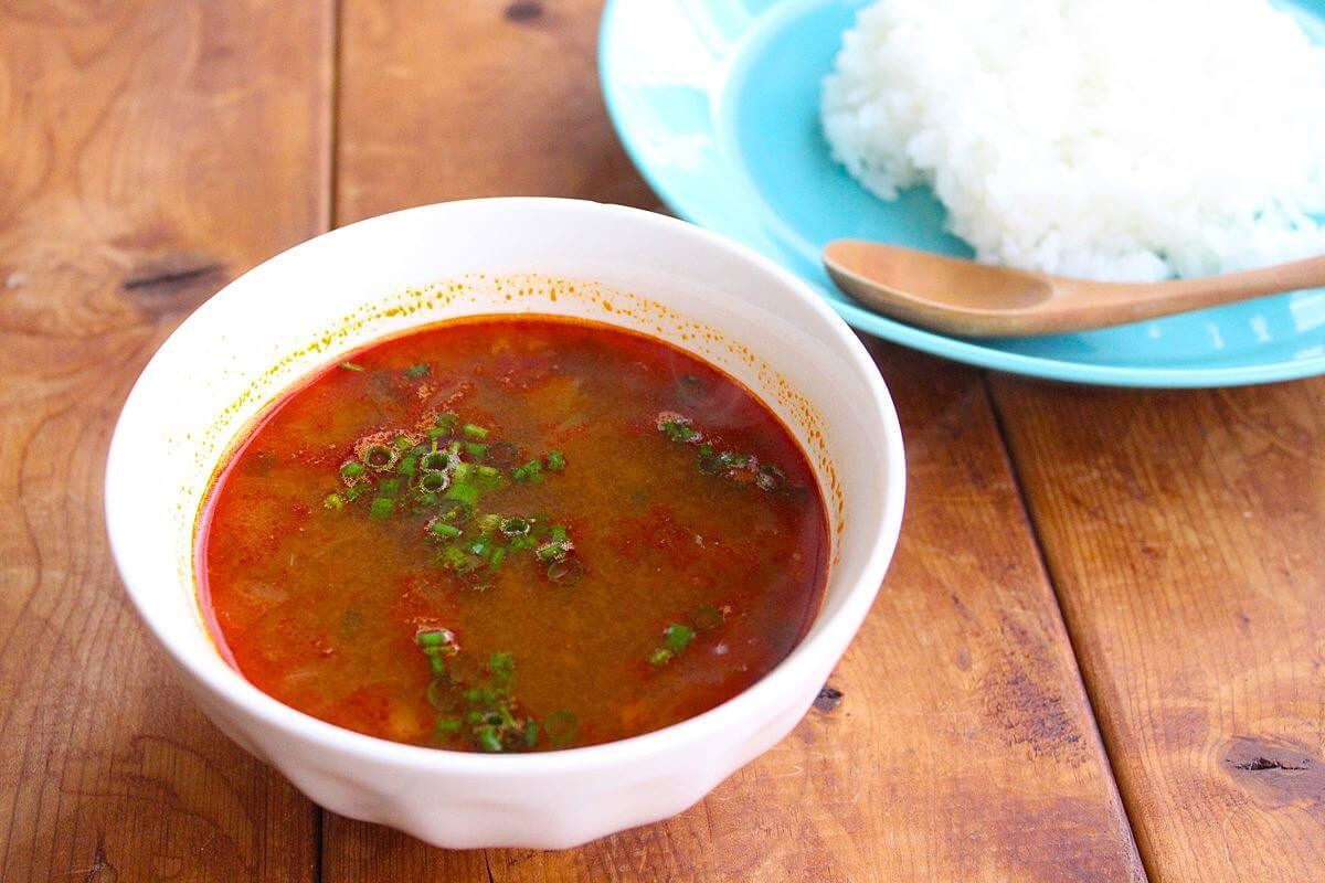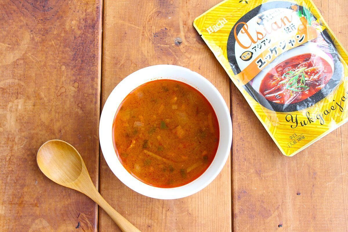 続いては、牛肉としいたけの旨みたっぷりのだしに、コクのあるコチュジャンを加えた韓国の辛いスープ「ユッケジャン」。