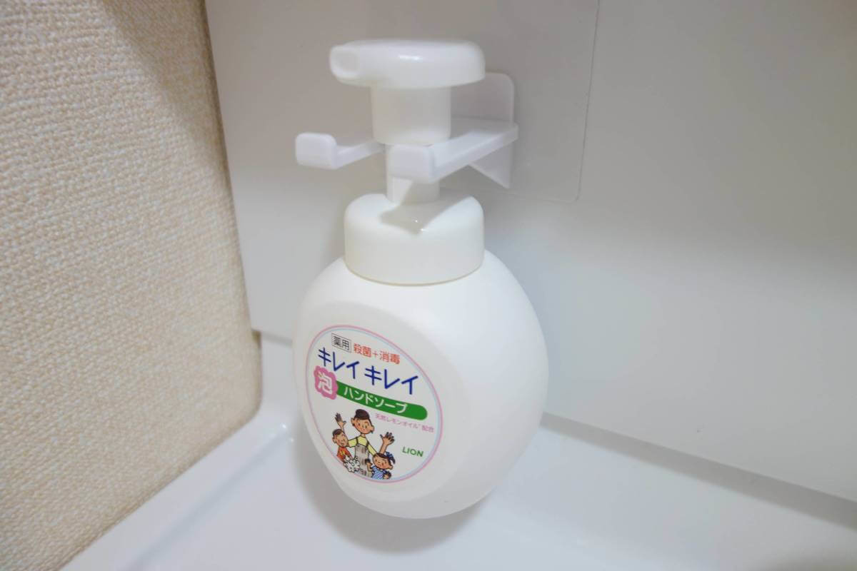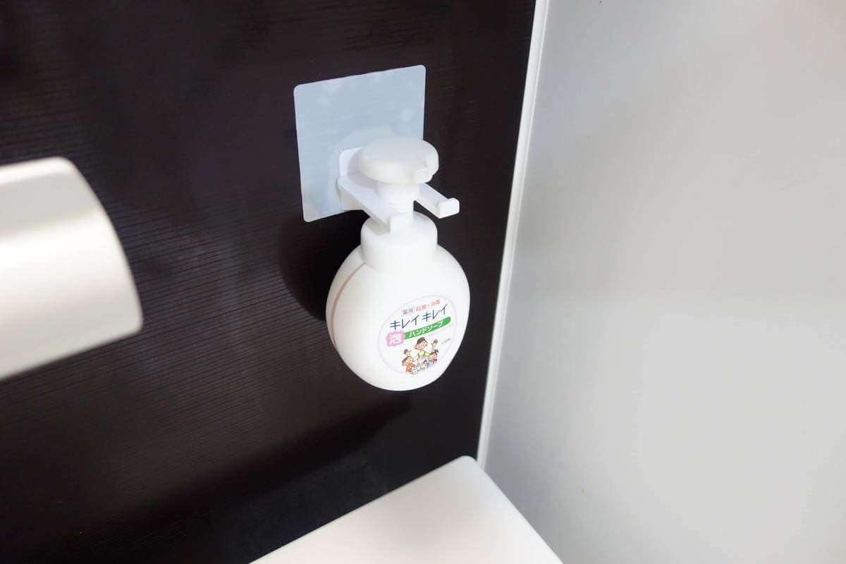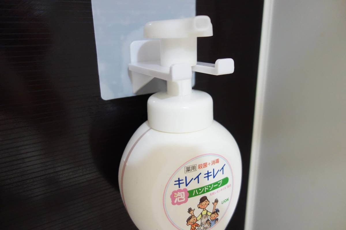 セリアの「貼っはがせる吸着シートシャンプーボトルフック」を使えば、シャンプーやハンドソープを浮かせて収納できます。