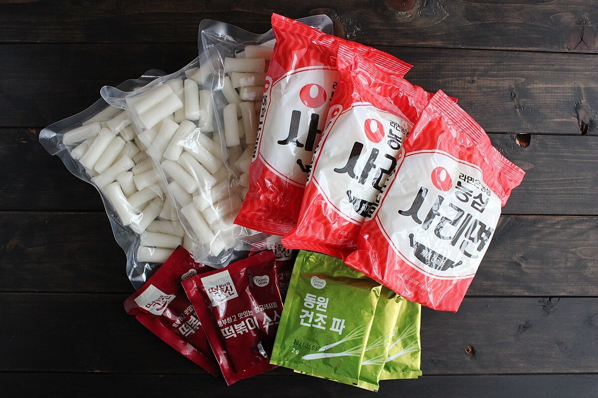 トッポキ、調味料、乾燥ネギ、乾麺がそれぞれ3セットずつ入っています。