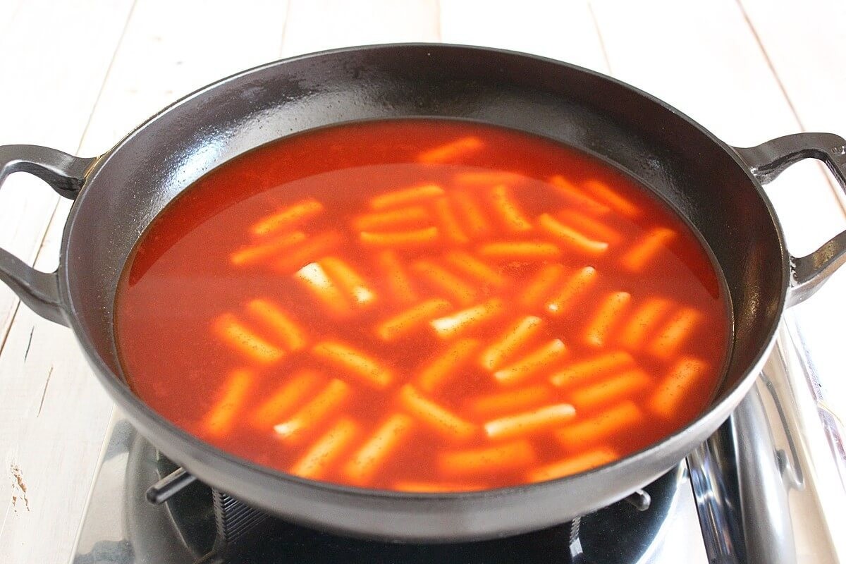もちを軽く洗い、フライパンに水500cc、もち、ソースを入れます。