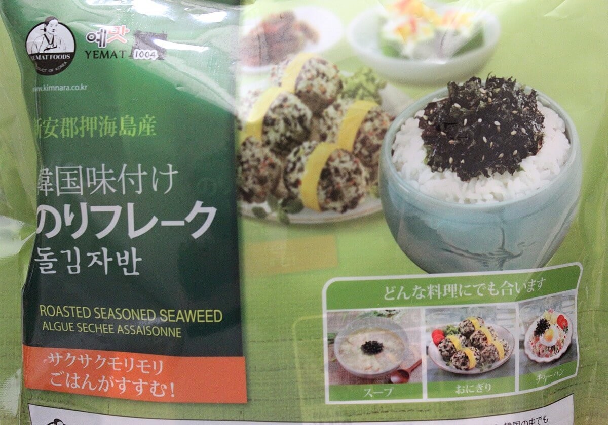 ごま油と塩、そして砂糖も入っており、色々なものがついつい進んでしまう危険な美味しさの韓国のりフレーク。