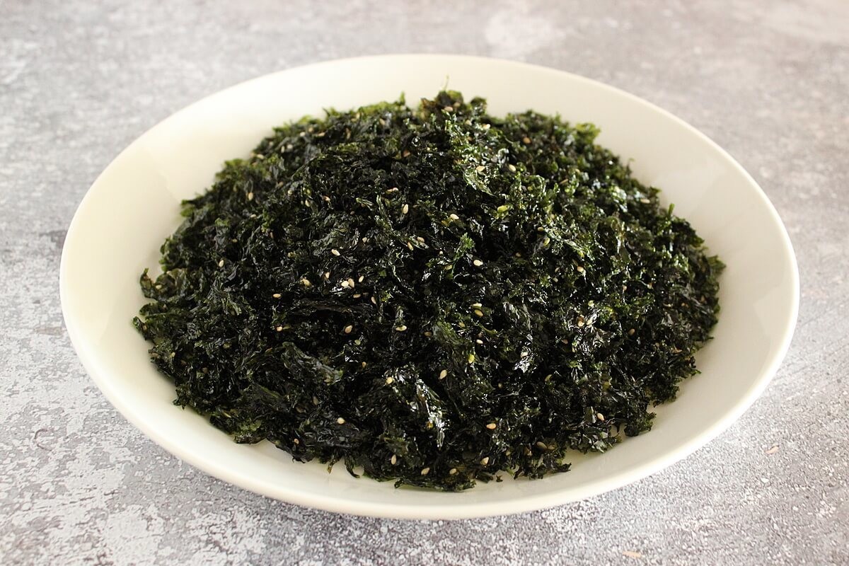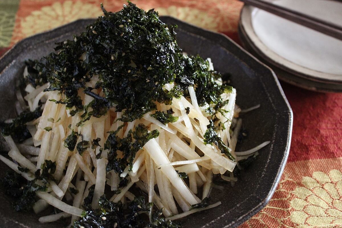 千切りにした大根を、水にさらしてからよく水を切り、中華系や醤油系のドレッシングであえ、その上にたっぷりの韓国海苔フレークを。