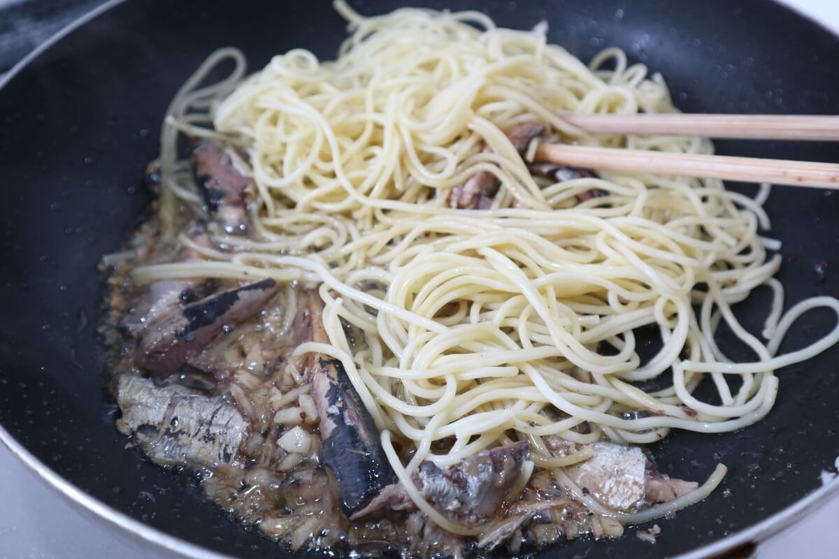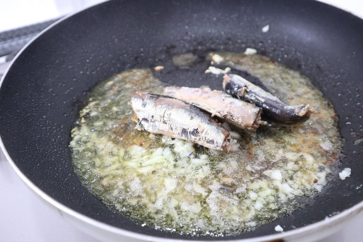 1、フライパンを中火にかけて、オリーブオイル、ニンニクを炒めて、オイルサーディンを油ごと加える。軽く身をほぐす。