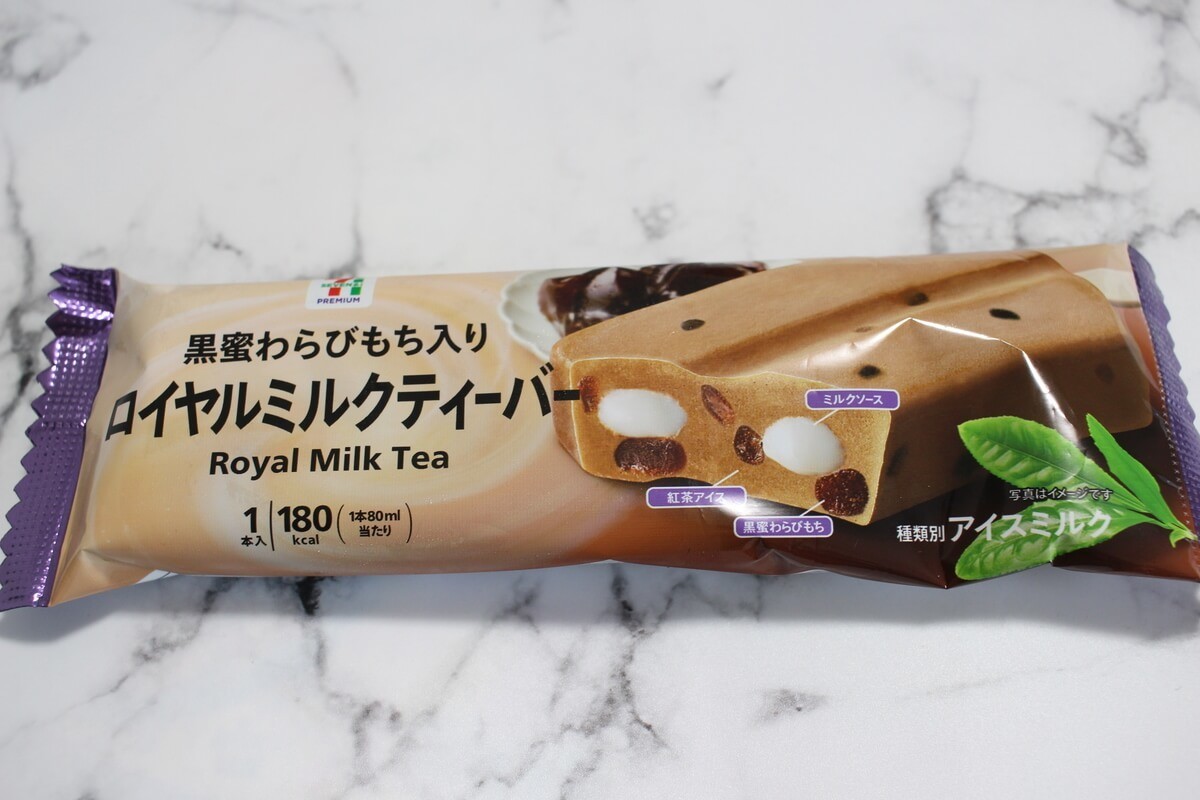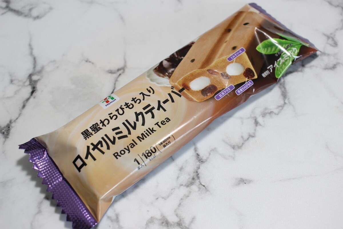 セブンイレブンで購入できる「黒蜜わらびもち入りロイヤルミルクティーバー」をご紹介しました。