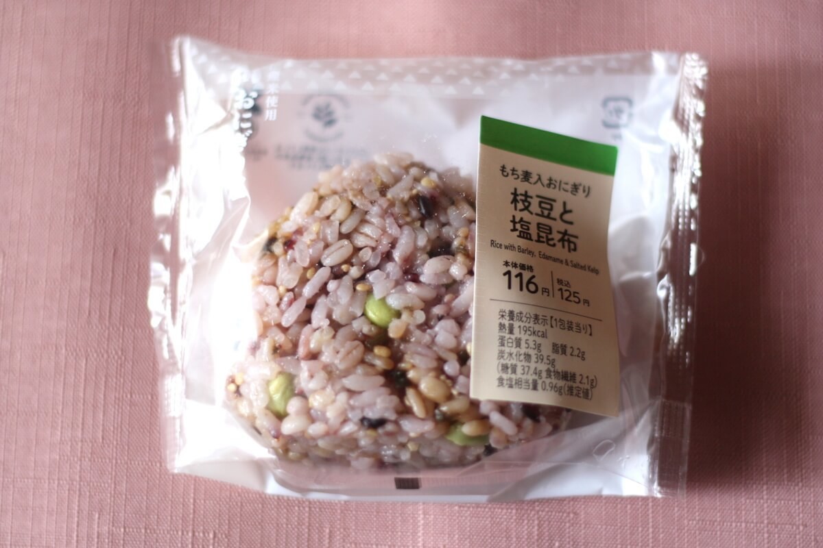 栄養価が高く食感のよい枝豆と、うまみのある塩昆布を混ぜ込んだ風味のよいおにぎりです。雑穀(黒米・もちきび・はと麦)をプラスしたもち麦ごはんを使用しています(ローソンホームページより)。
